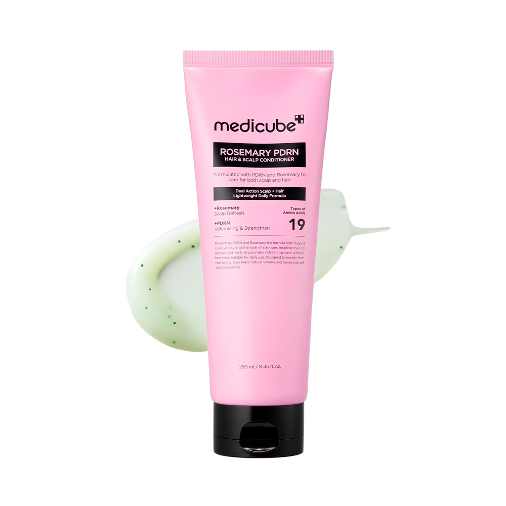Medicube Rosemary PDRN Hair & Scalp Conditioner. Condicionador leve e nutritivo desenvolvido para tratar o cabelo desde o couro cabeludo até as pontas. Ideal para cabelos secos, finos e danificados, proporciona hidratação intensa, maciez e desembaraço sem pesar, mantendo os fios leves e com aspecto saudável.