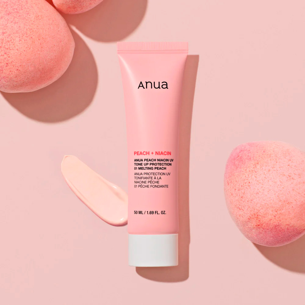 O Anua Peach Niacin UV Tone Up Protection 01 Melting Peach é um protetor solar facial multifuncional que protege a pele contra os raios UV enquanto ilumina e uniformiza o tom. Enriquecido com niacinamida e extrato de pêssego, proporciona efeito tone-up natural, hidratação e acabamento radiante, deixando a pele com aparência saudável, fresca e luminosa.