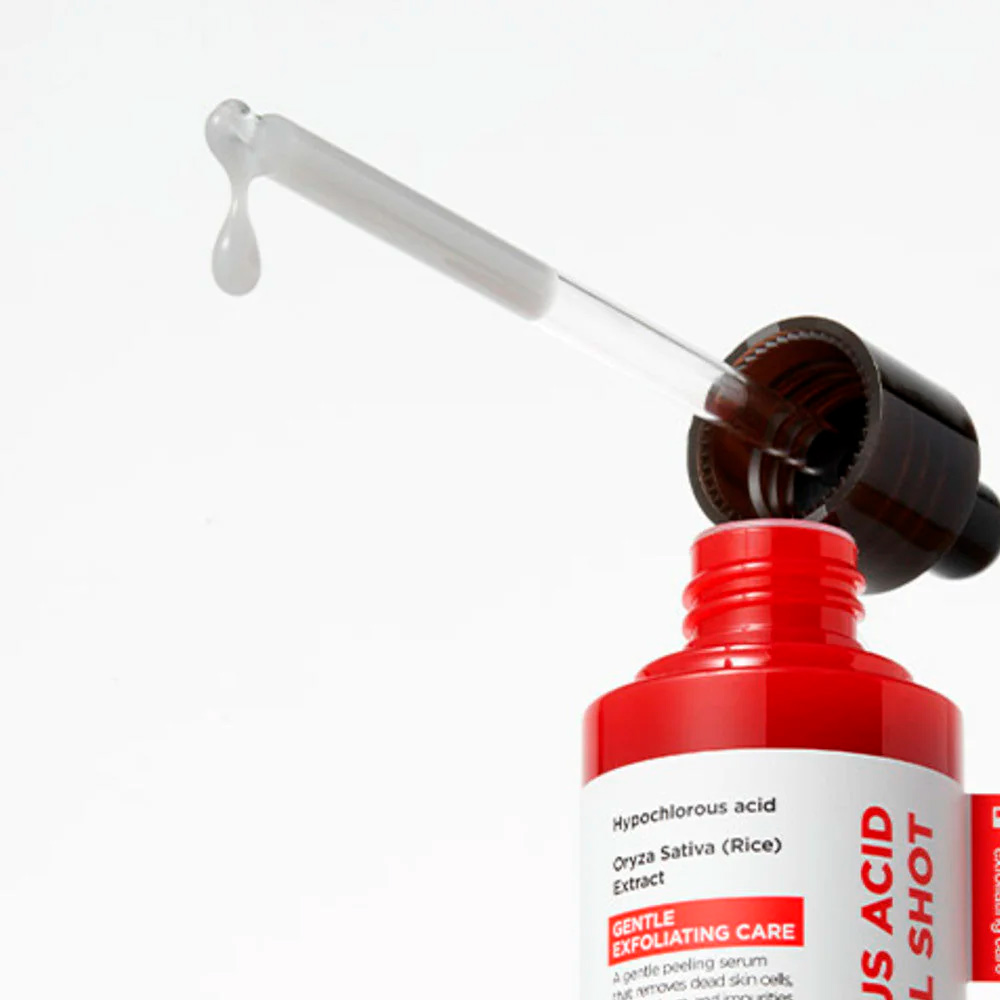 O Hypochlorous Acid Rice Peel Shot é um sérum esfoliante suave desenvolvido para ajudar a remover células mortas, impurezas e excesso de oleosidade, deixando a pele mais limpa, uniforme e revitalizada. Sua fórmula combina Ácido Hipocloroso (HOCl) e Extrato de Arroz, ativos conhecidos por ajudar a purificar e acalmar a pele enquanto promovem uma esfoliação delicada.