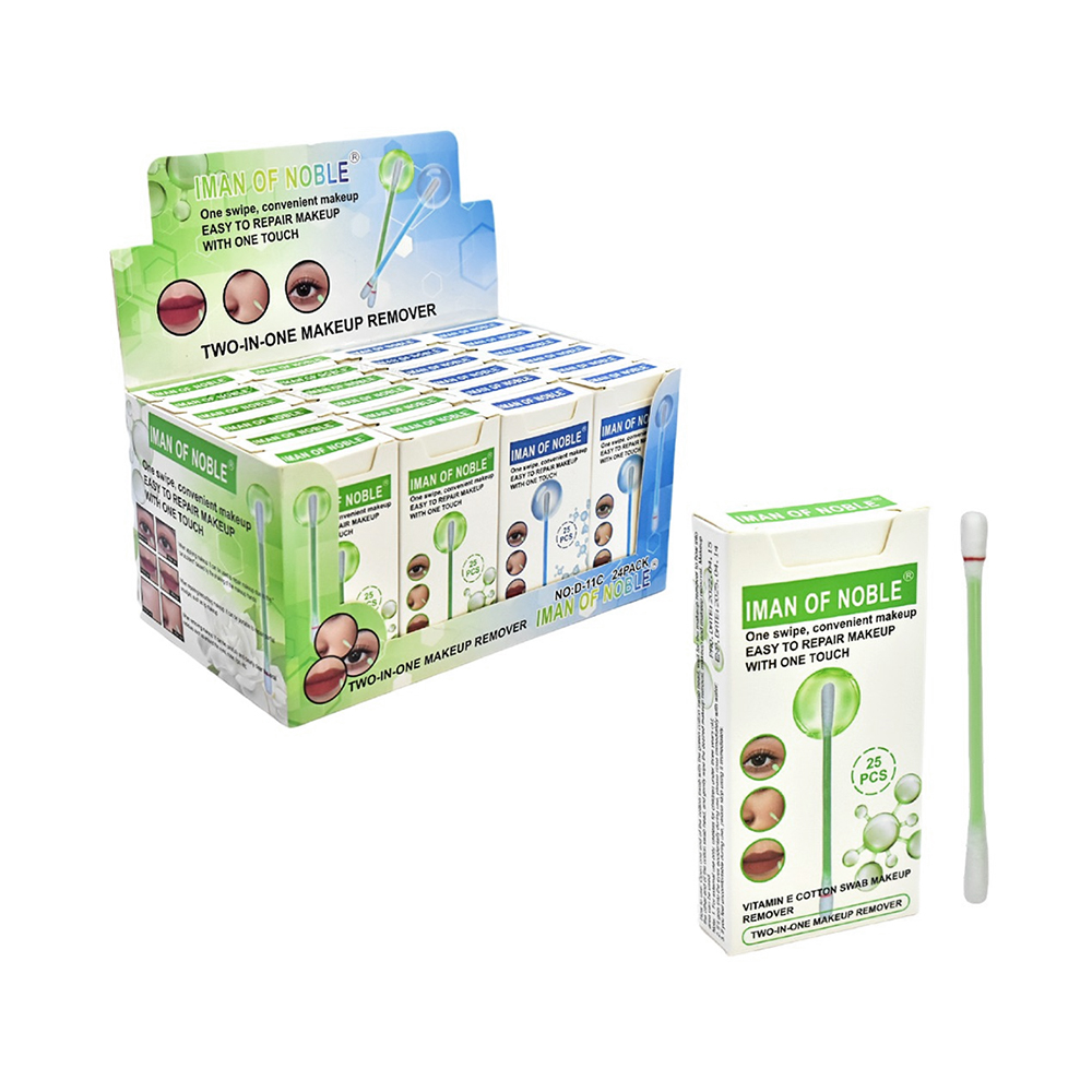 O removedor de maquiagem Iman Of Noble em forma de cotonete com vitamina E e aloe vera é ideal para remover instantaneamente os resíduos de maquiagem. Também pode ser usado como corretivo e reparar a maquiagem que se fixou devido a um acidente de carro causado por mãos trêmulas ao aplicar a maquiagem. Facilita a limpeza da maquiagem principalmente no nariz, nos olhos e nos lábios.