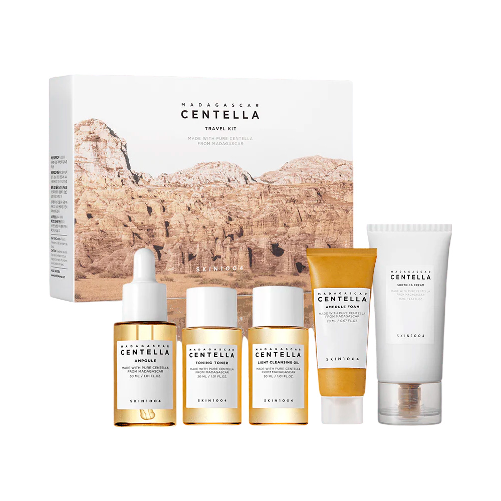 O Centella Travel Kit reúne 5 produtos em tamanho mini da linha Centella, desenvolvidos para acalmar a pele sensível, fortalecer a barreira cutânea e manter a hidratação durante a rotina ou em viagens. Sua seleção inclui limpeza em duas etapas, tonificação, ampola calmante e creme hidratante leve, oferecendo cuidado completo com foco em equilíbrio e conforto da pele.
