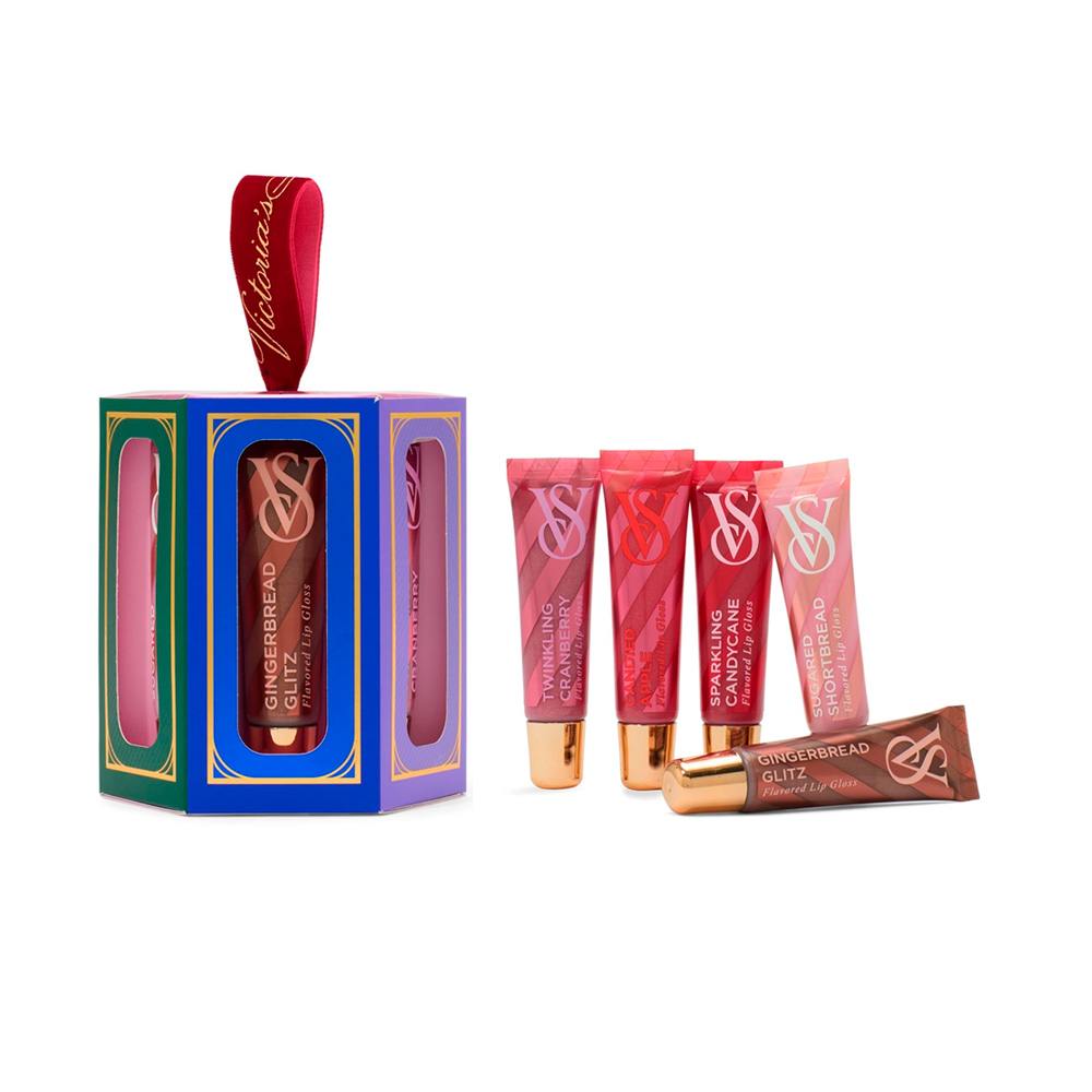 Este kit de presente inclui cinco lip gloss com sabores deliciosamente festivos inspirados na temporada de Natal.