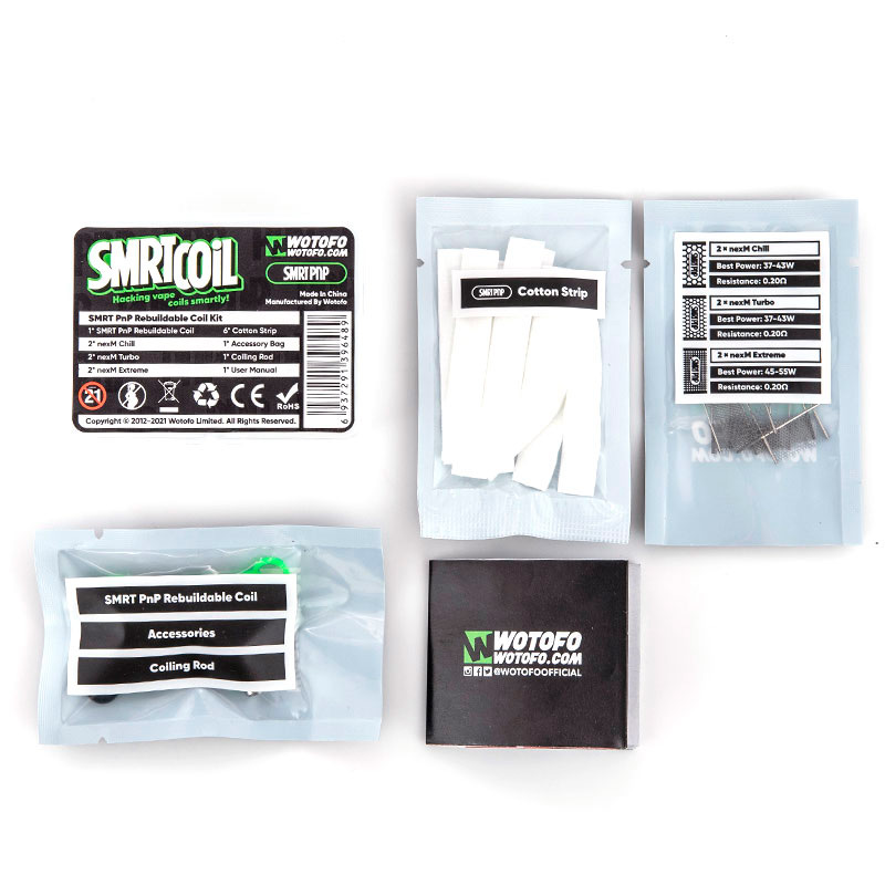 kit de bobina reconstruÃda SMRT PnP da Wotofo é um kit integral que permite que você aproveite a reconstrução do seu pod vape para que possa alterá-lo de acordo com suas preferências. O kit vem com três tipos diferentes de bobinas nexMESH, ou seja nexMESH Chill, nexMESH Turbo e nexhMESH Extreme. Ele também inclui uma bobina reconstruÃvel SMRT PnP, tiras de algodão e uma bolsa de acessórios conveniente para ajudá-lo a carregar tudo com você.