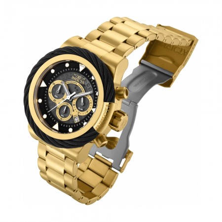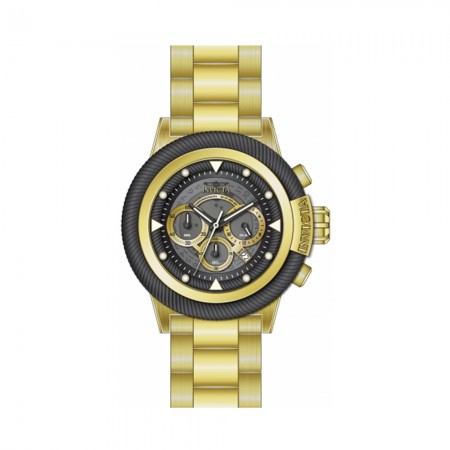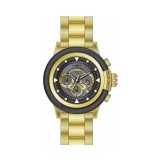 Caixa em aço inoxidável dourado com pulseira de aço inoxidável dourado. Moldura fixa em aço inoxidável preto e dourado. Mostrador preto com ponteiros dourados e marcadores de horas. Marcadores de minutos em torno da borda exterior. Tipo de discagem: analógico. Mãos e marcadores luminescentes. Data apresentada entre as 4 e as 5 horas. Cronógrafo - mostrador secundário: três - 60 segundos, 60 minutos e 24 horas. Movimento de quartzo. Cristal mineral resistente a riscos. Caso sólido de volta. Forma redonda da caixa, tamanho da caixa: 50 mm, espessura da caixa: 16,6 mm. Largura da banda: 24 mm, comprimento da banda: 8,25 polegadas. Resistente à água a 100 metros. Funções: cronógrafo, data, GMT, segundo fuso horário, hora, minuto, segundo.