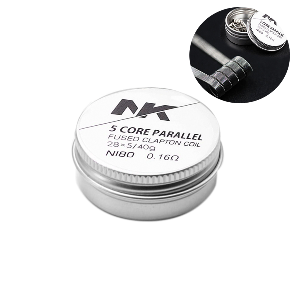 As resistências paralelas de 5 núcleos da marca NK para uso no vape, são resistências de Clapton fundidas de 0,16 ohm, que proporcionan vaporização de qualidade.