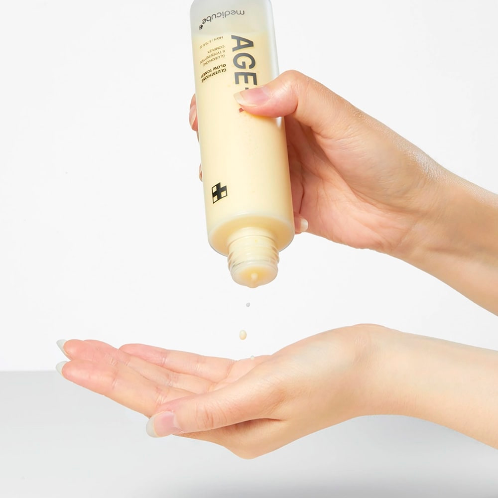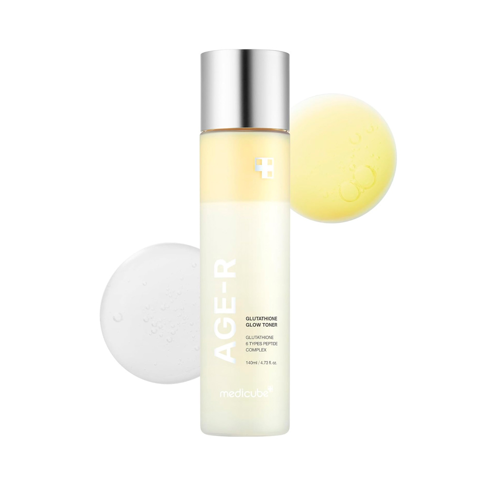 Medicube Age-R Glutathione Glow Toner. Um tônico iluminador avançado que ajuda a uniformizar o tom da pele e revelar um glow natural. Sua fórmula com glutationa, alfa-arbutina e niacinamida atua na redução de manchas e opacidade, enquanto ingredientes botânicos e peptídeos promovem hidratação, elasticidade e aparência mais jovem.