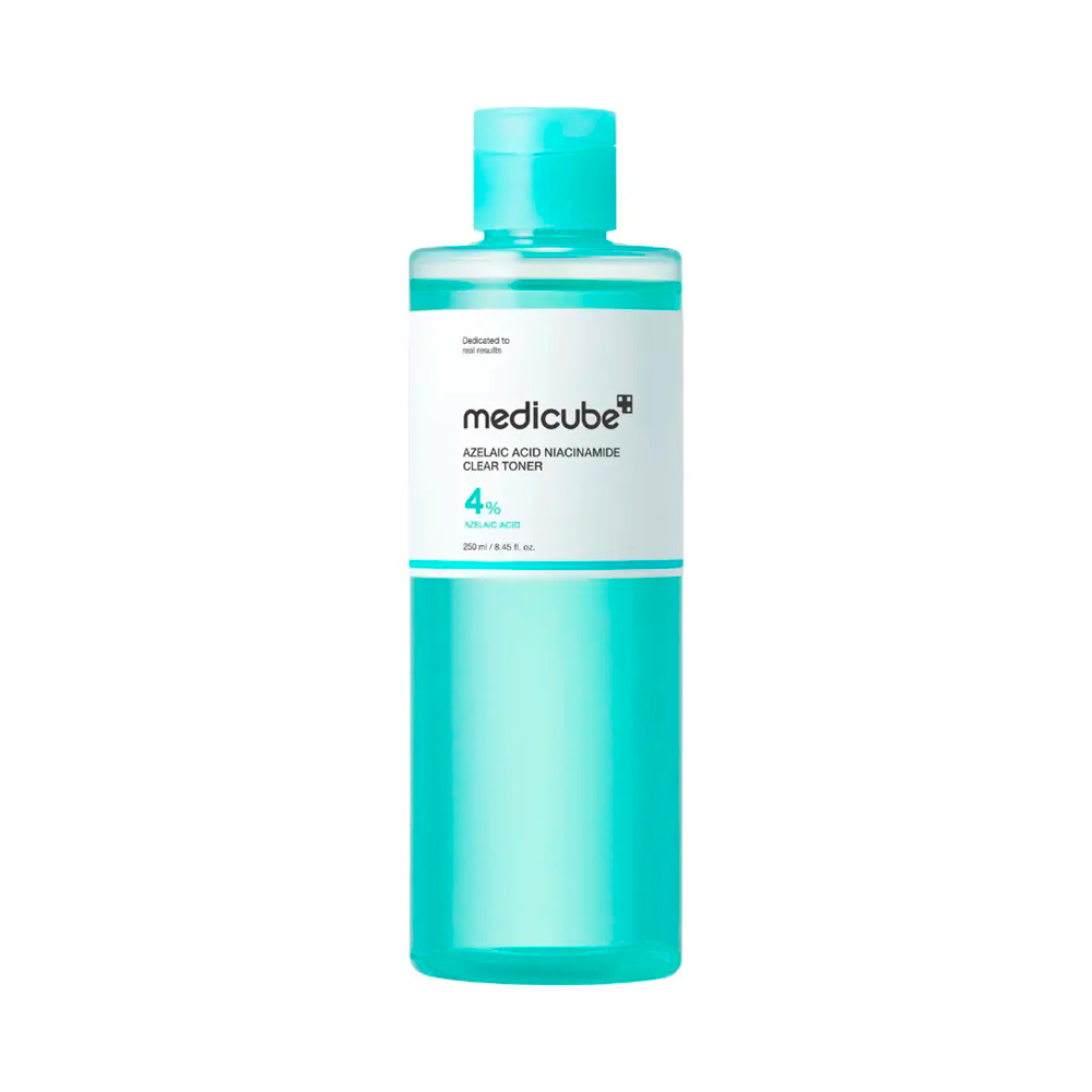 Tônico Medicube Azelaic Acid Niacinamide Clear Toner Medicube. Um tônico equilibrante com 4% de ácido azelaico que ajuda a iluminar, uniformizar o tom da pele e controlar a oleosidade. Sua fórmula com niacinamida promove esfoliação suave, reduz vermelhidão e auxilia na aparência de acne e manchas, enquanto hidrata e fortalece a barreira cutânea.
